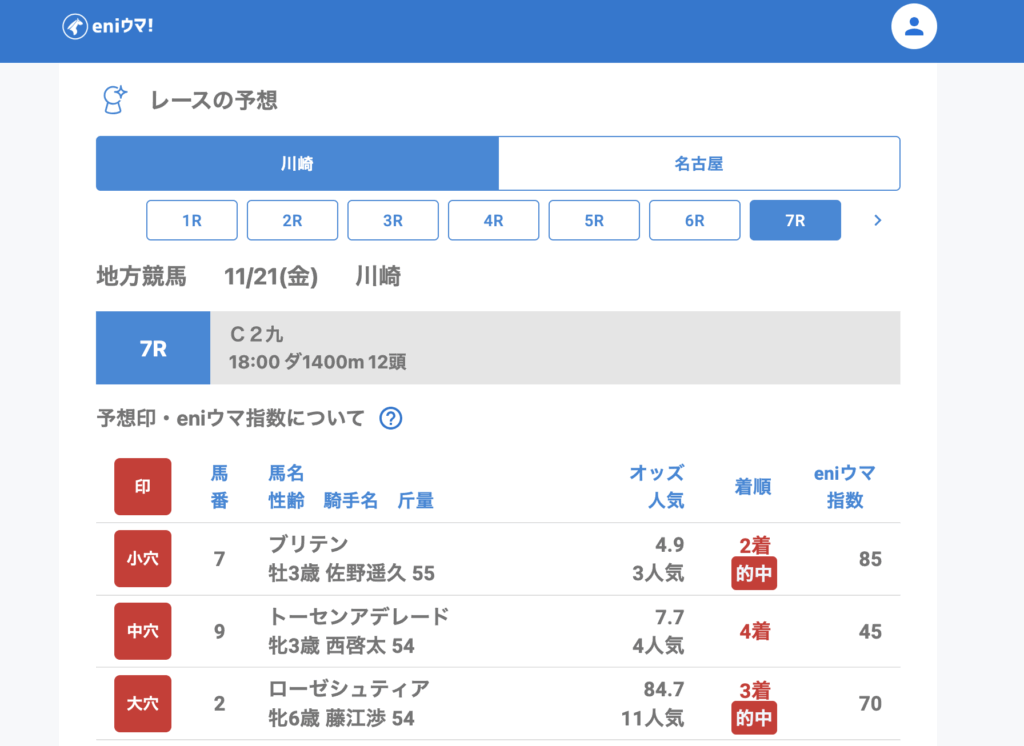 さらに2Rでも小穴単勝が続き、7Rでは小穴に加えて大穴ローゼシュティア84.7倍【70】とのダブル的中も決まり、波乱をしっかり捉えた一日となりました。