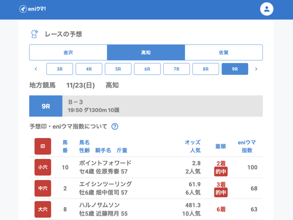 高知ではフリーホースパーク47.1倍【63】、エイシンツーリング61.9倍【68】など