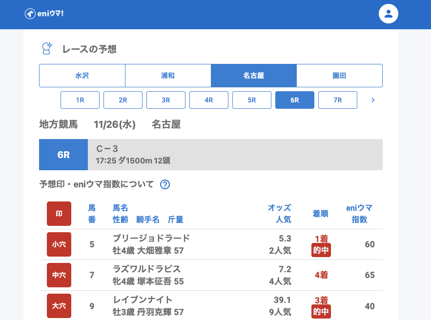 水沢では小穴単勝が4回的中。中穴の的中も複数あり安定した結果でしたが、昨日に比べると大きな穴馬の発見は少なめでした。