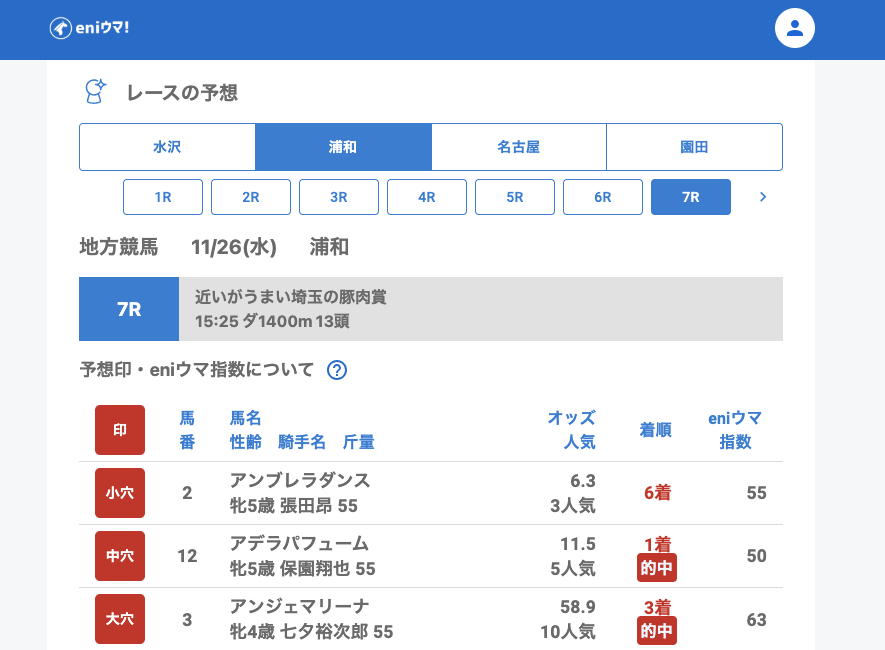 浦和では大穴シンキングセンティ28.3倍【60】が的中。アデラパフューム11.5倍【50】など単勝的中が複数確認され、堅実な1日でした。