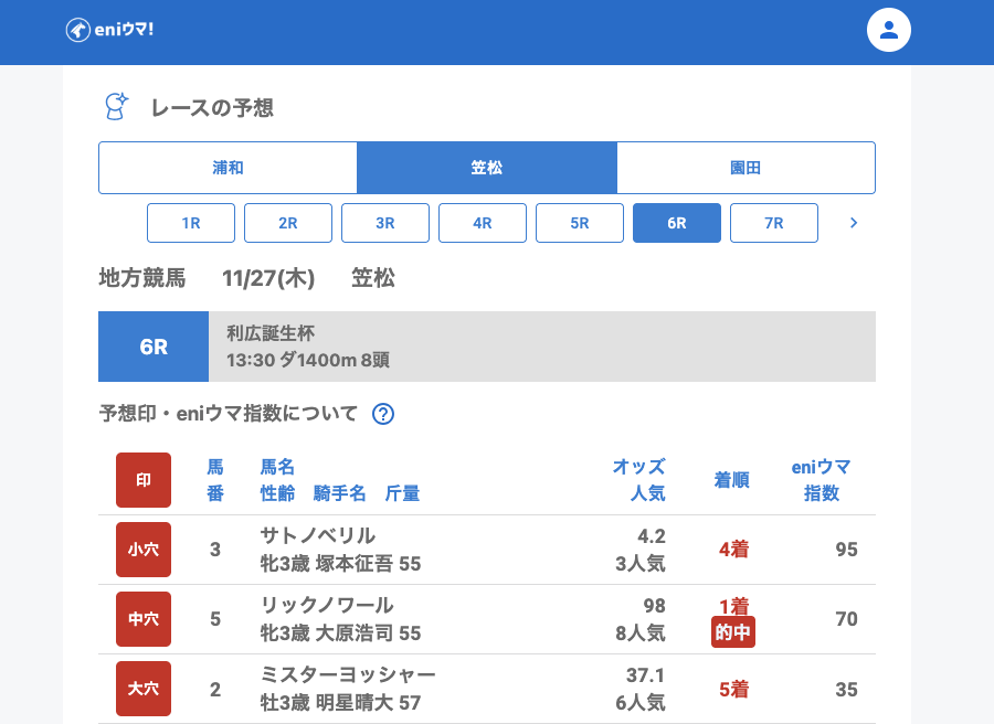 笠松では大穴リックノワール98.0倍【70】を単勝で的中。