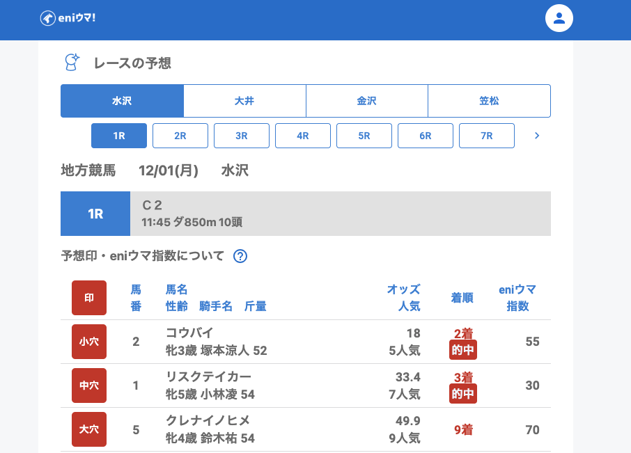水沢では1Rからコウバイ18.0倍【55】とリスクテイカー33.4倍【30】のダブル的中でスタート。
