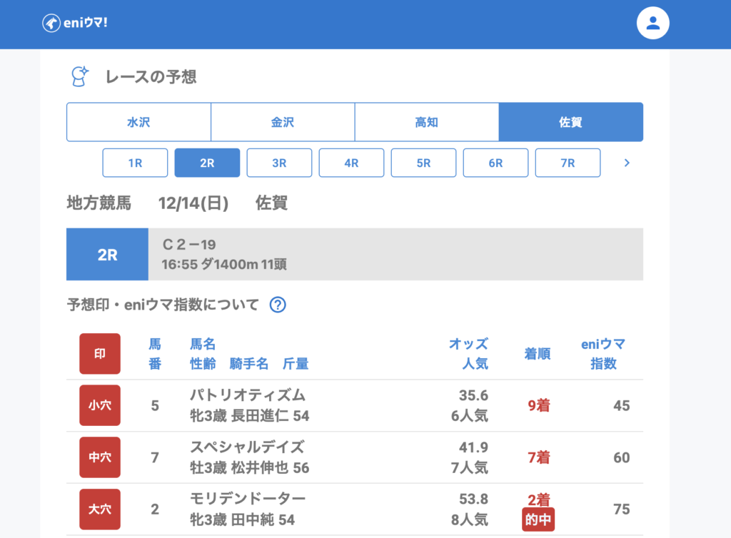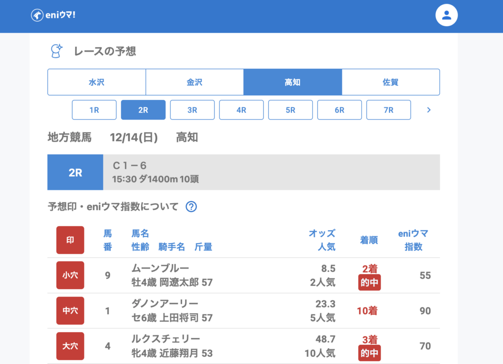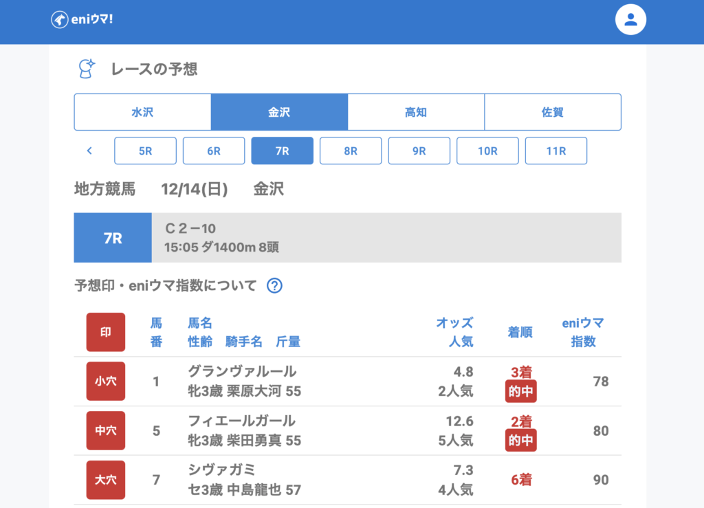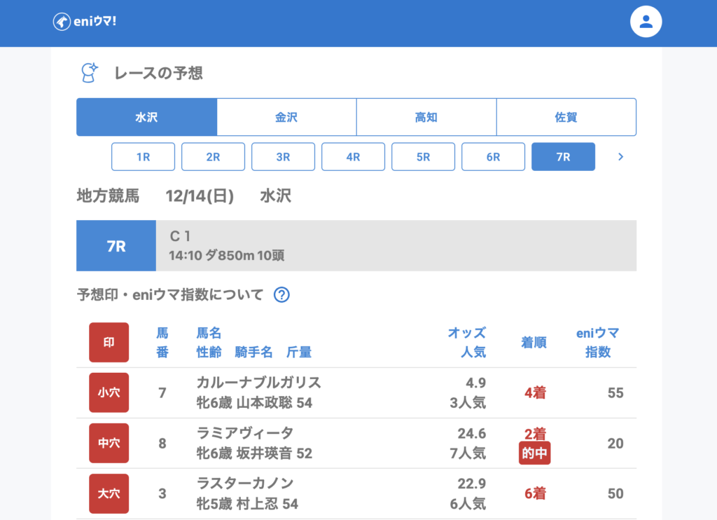 限られたレース数の中でも eniウマ!は3レース的中。