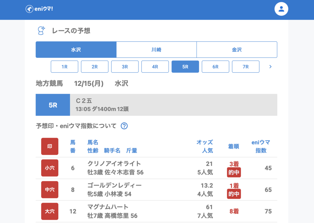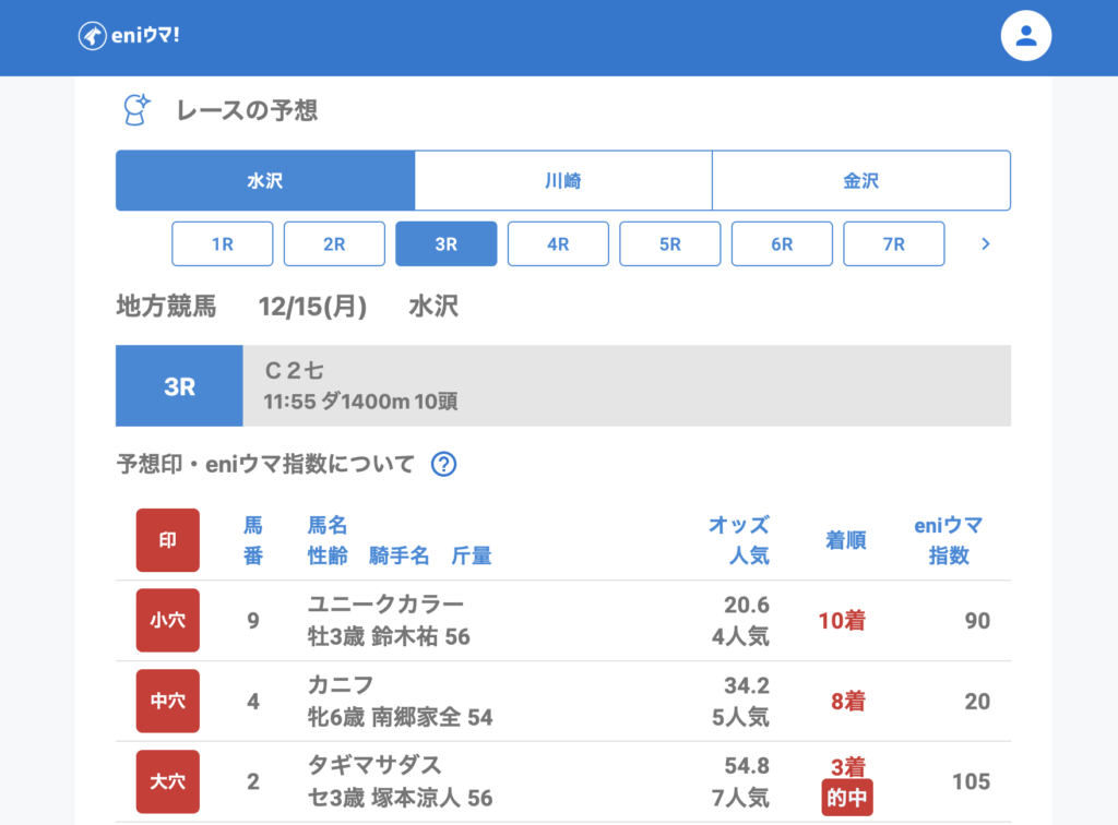 また、eniウマ!指数が示していた穴馬 タギマサダス54.8倍【105】 が3着に好走するなど、指数の狙いがハマる場面も見られました。