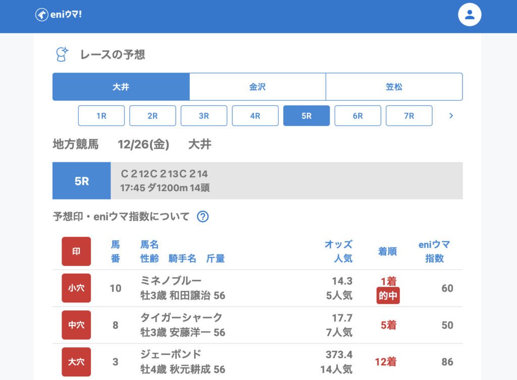 大井は、ミネノブルー14.3倍【60】を含めて単勝的中が4回。