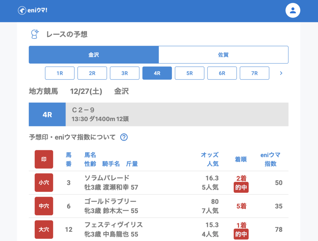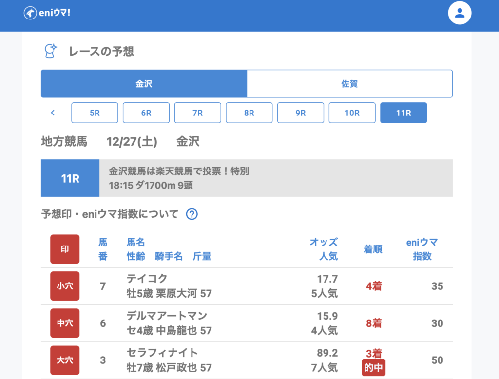 金沢では、大穴予想の推奨馬が予想公開後に人気を集めてしまい、オッズが下がるレースが2回ほど見られました。それでも、馬券内にはしっかり入っており、内容としては悪くない結果となっています。