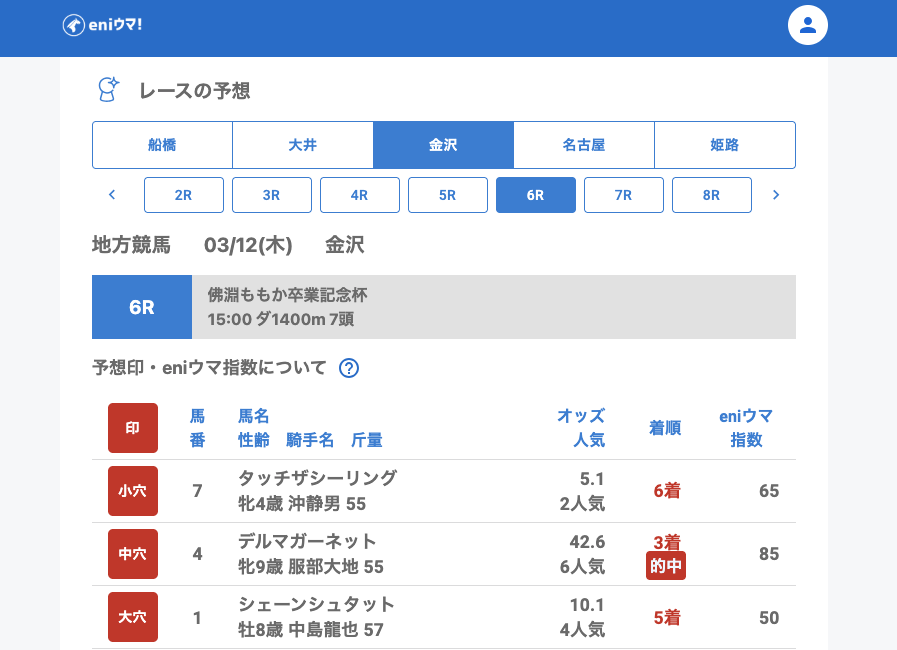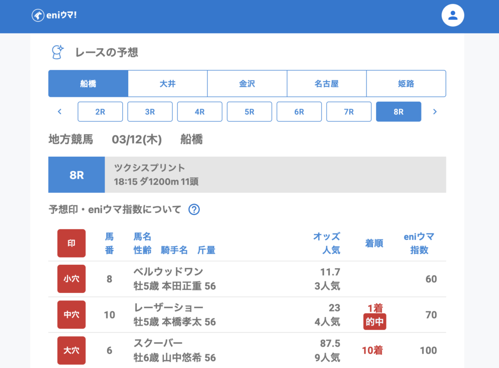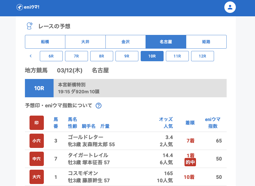 3月12日(木)の地方競馬は、船橋・大井・金沢・名古屋・姫路の5会場が開催されました。