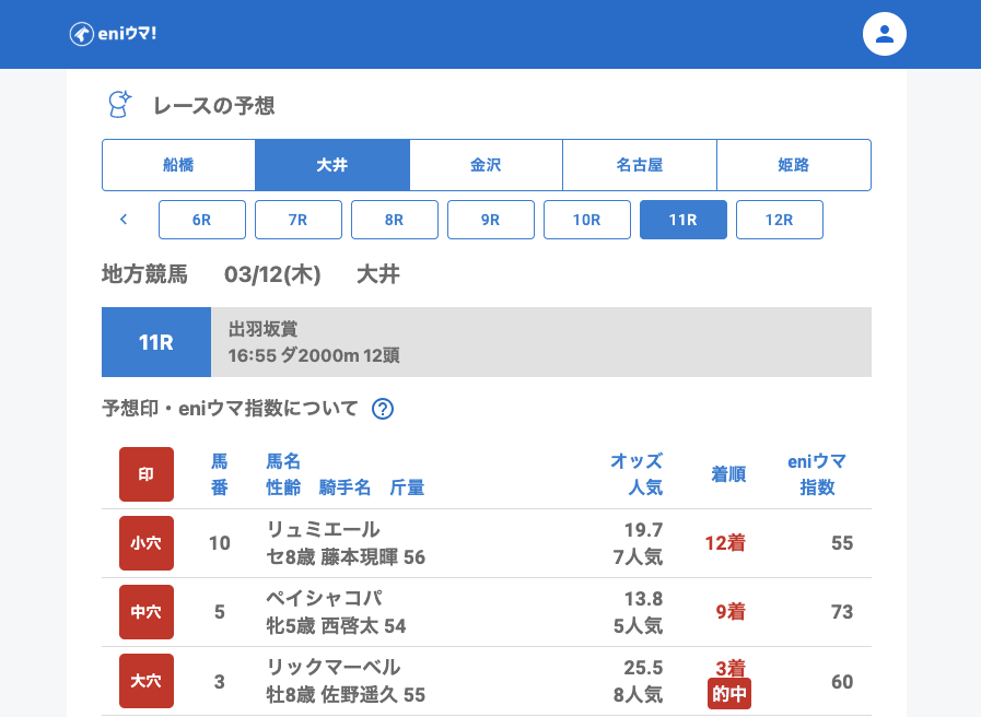 小穴〜中穴予想が当たり、11R・12Rでは小穴予想の単勝的中が連続しました。