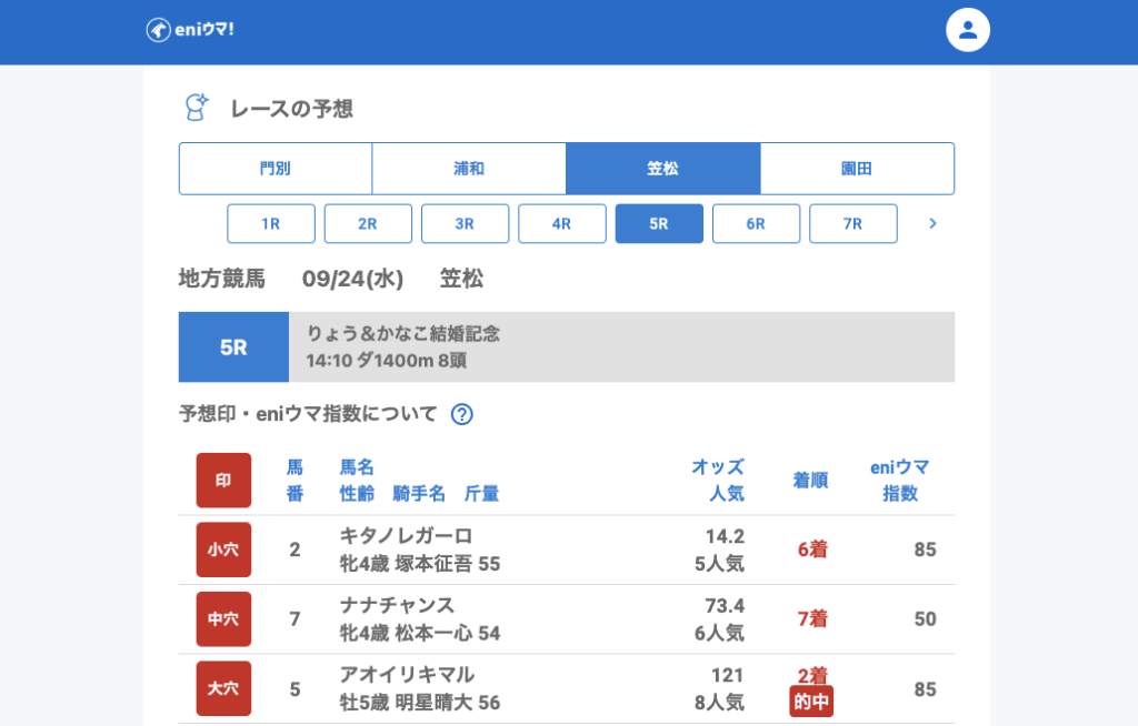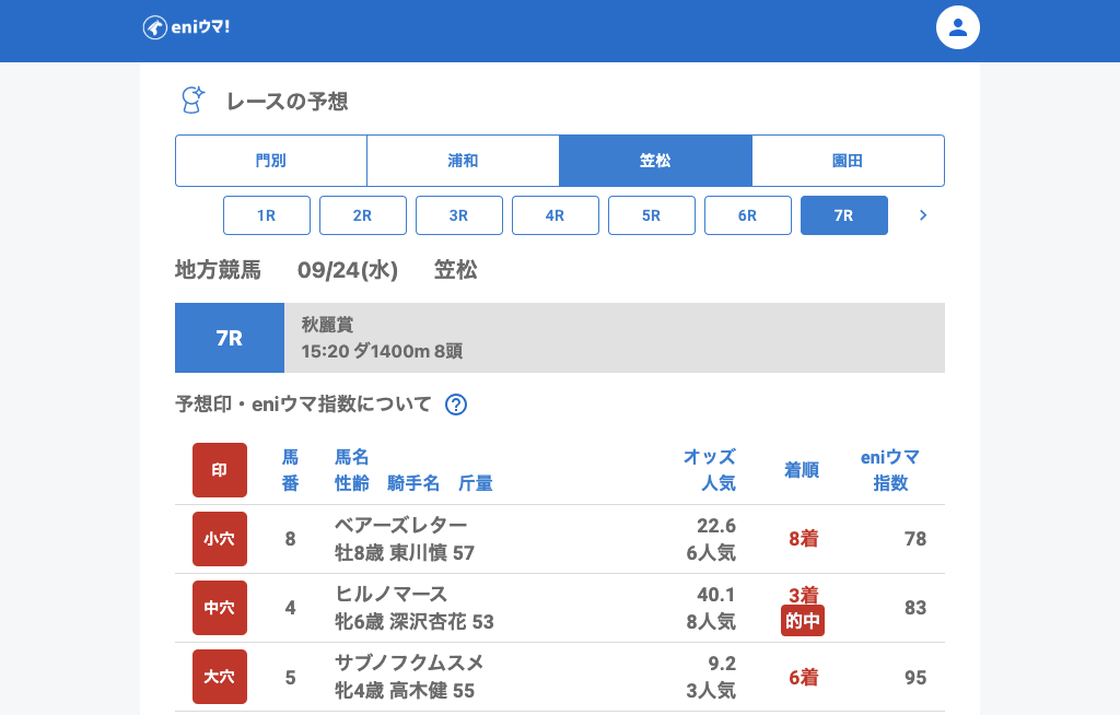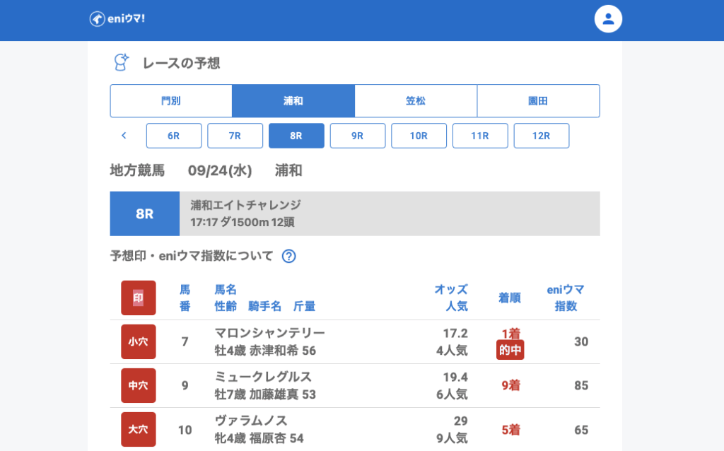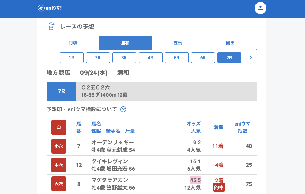 浦和では大穴マケタラアカン(45.5倍/eniウマ!指数75)、サモアノカイジン(16.3倍/eniウマ!指数40)などを的中。さらにマロンシャンテリー(17.2倍/指数30)で単勝を拾うなど好内容。