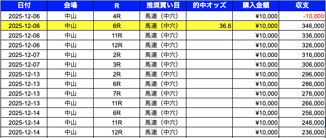 中山は的中1レースですが、収支はプラス。